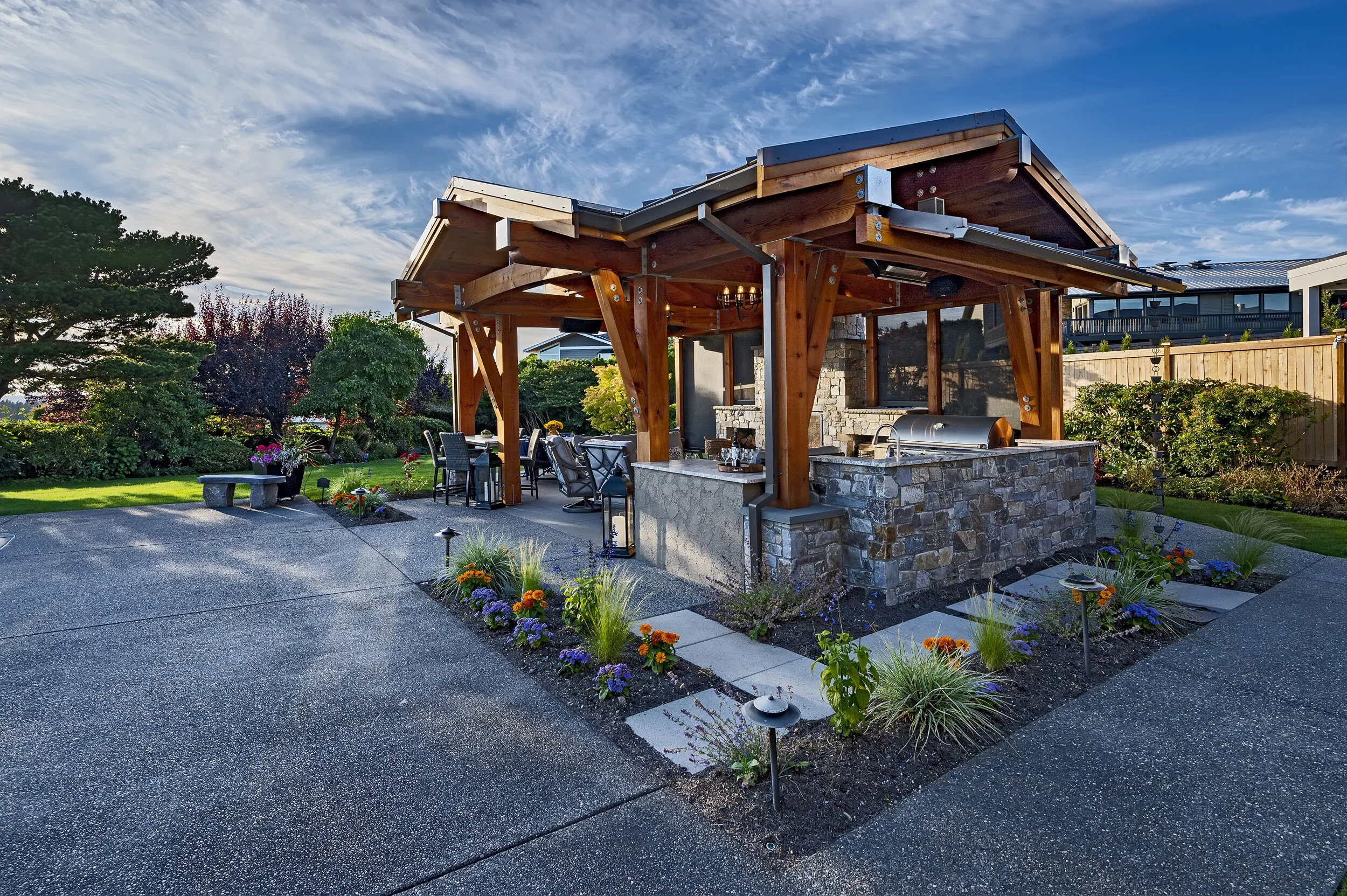 This new heavy-timber poolside entertaining space includes an outdoor kitchen, wood-burning fireplace, and gas heaters to extend the usefulness of the space into the cooler months.